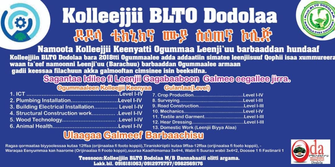 Dodola TVET College announces the opening of admissions for the 2018 E.C. academic year. Interested and qualified applicants may apply in person.